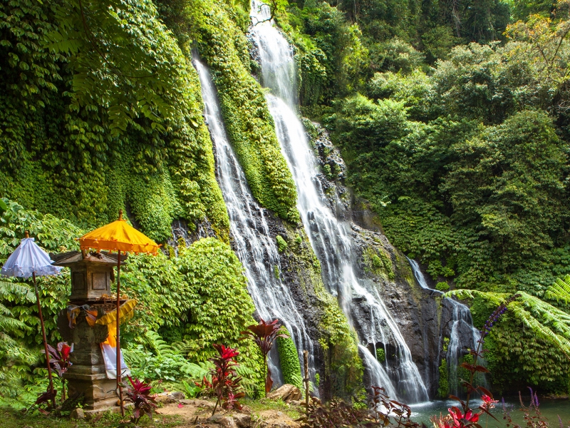 - Vous terminez par une halte à la cascade de Git-Git, l’une des plus spectaculaires de l’île. Depuis un col dominant la forêt luxuriante, vous apercevez les deux lacs jumeaux de Tamblingan et Buyan. Le trajet dévoile peu à peu une autre facette de Bali, rurale, fraîche et authentique.